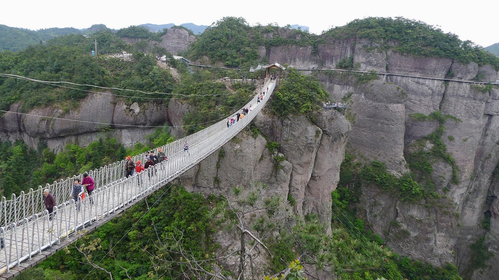 拉著侄女走上觀景臺(tái),觀景臺(tái)有些是懸挑砼板梁澆注出來(lái)的,有些是鋼結(jié)構(gòu)焊出來(lái)的,懸挑的幅度與高度都不是很大。走過(guò)天橋以后這個(gè)算是小兒科了,我可以在上面跳,沒(méi)有一絲抽心的感覺(jué)。轉(zhuǎn)了個(gè)圈,再拍了些風(fēng)景,一看時(shí)間已經(jīng)是四點(diǎn),山上的游客也越來(lái)越少,雖然很是留戀,但據(jù)說(shuō)下山的時(shí)間還要兩個(gè)小時(shí),所以我們得抓緊時(shí)間返回。經(jīng)詢問(wèn)下山必經(jīng)之路是天橋,看來(lái)老媽他們幾個(gè)是逃不過(guò)了,于是我拉著媽媽和女兒走在舅舅后面再上天橋,這一次真的很好,沒(méi)有任何的恐懼感,當(dāng)然也不敢再往下看了??赡苁且?yàn)槟昙o(jì)小,女兒一上橋就興奮,跑開(kāi)去了,半點(diǎn)不知道害怕,老爸他們斷后。前面的舅舅也很淡定,一步一步地朝前走著,上“岸”時(shí),他粗粗地呼了一口氣,說(shuō)了句一共100多步,原來(lái)這淡定也是裝出來(lái)的。老媽和阿姨們也到了,我聽(tīng)老媽說(shuō)自己的雙腳一直在抖。我還問(wèn)女兒:“你怕不?”她回道:“有什么好怕的,兩邊都有欄桿,還有網(wǎng),要是再加一個(gè)蓋就更牢了。”我笑了,真是初生牛犢不怕虎。